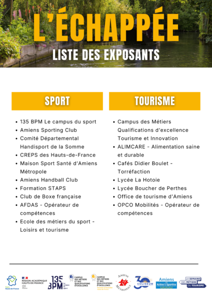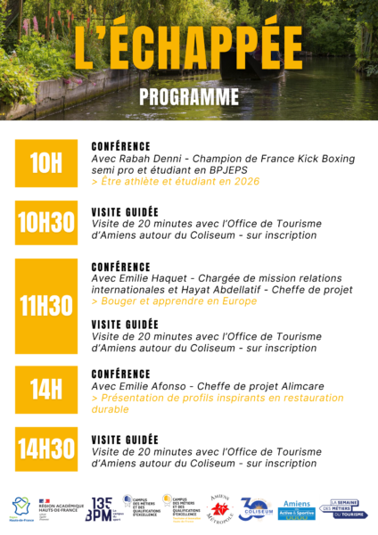 📅 Le 10 février 2026, au Coliseum d’Amiens, 135 BPM Le Campus du Sport, en partenariat avec le Campus des Métiers et des Qualifications d’excellence du Tourisme et Innovation, organise la première édition de L’Échappée, un événement d’orientation innovant destiné aux collégiens et lycéens de la région.